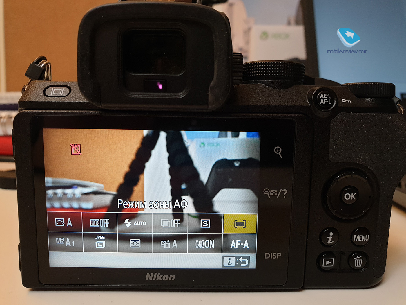Впечатления от использованияNikon не обманули: камера действительно очень проста в использовании. Большую часть времени снимаешь в автоматическом режиме и радуешься жизни. Для съёмки можно использовать как экранчик, так и видоискатель. Переключение между ними может происходить или автоматически, или принудительно по кнопке в левом верхнем углу. У видоискателя есть плюс, там, помимо сетки, отображается ещё линия отклонения от горизонта, которая становится зеленой, когда совпадает.