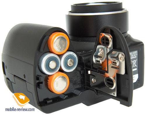 Передача данных. Для подключения к внешним устройствам (USB, video/audio) используется универсальный разъём. К нему можно подключить один из двух проводов, идущих в комплекте: USB либо A/V. Камера поддерживает стандарт USB 2.0, но реальная скорость передачи данных составляет 762 Кб/с в пике. Питание. Питание камеры осуществляется от 4 пальчиковых батарей типа АА, двух элементов CR-V3 или аккумуляторов, возможно подключение к электросети через сетевой адаптер переменного тока, который можно приобрести отдельно. Энергопотребление можно характеризовать как среднее – около 100 снимков на одну зарядку (1600 mAh). Производитель не приводит расчетных данных по ресурсу энергопотребления.