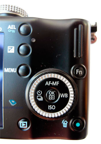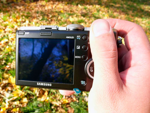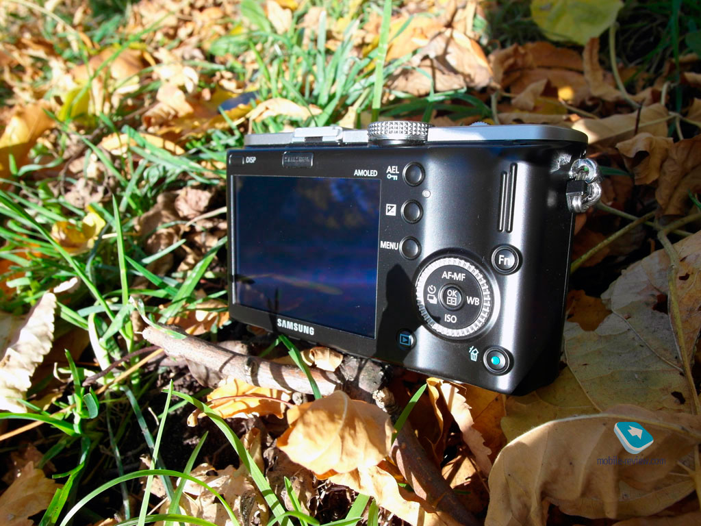 Как видно из таблицы, габариты новинки меньше своего предшественника по всем пунктам. Вес сократился практически на 20 процентов, что положительно сказалось на впечатлении о продукте. Сравнивая с Sony NEX 5, приходим к выводу, что японский аппарат значительно меньше и легче, чем «сотка». По ощущениям в руке камера ближе всего к Olympus PEN E-PL1. Аппарат полностью выполнен из гладкого, но не глянцевого пластика. Его качество не вызывает у меня сомнений, но по внешнему виду камера проигрывает конкурентам. Здесь нет вставок из резины, металла, поверхность не фактурная. Не хотелось бы это говорить, но камера смотрится дешевле, чем стоит, хотя надо отдать должное дизайну. Он запоминается на раз. Если Olympus Pen навевает мысли о ретро, Sony NEX выглядит techi, Panasonic G2 делает вид, что он зеркалка, то NX100 не напоминает ничего. Минимализм и плавные формы. Но камера выглядит безлико - в ней нет того, за что взгляд мог бы зацепиться. У меня на руках образец черного цвета с серебристой крышкой в верхней части, такие и будут поставляться в Россию. Также есть камеры коричневого, серебристого и белого цвета, которые, возможно, появятся позже. На лицевой стороне, помимо объектива и кнопки замка байонета, есть светодиод автофокусировки. Она тут, как водится, контрастная. Большую часть тыльной стороны занимает дисплей. Справа от него расположились основные элементы управления: кнопки AEL, экспозиции, меню, просмотра отснятого материала. По центру находится крупная навигационная клавиша с многофункциональным кольцом. Правее нее расположились кнопки Fn и удаления. ![]() ![]() ![]() Наверху можно видеть разъем горячий башмак, отверстие микрофона, диск выбора режима работы камеры, двухпозиционную кнопку спуска затвора, многофункциональный ролик и отверстия динамика. На правом торце под пластиковой дверкой собраны все интерфейсы камеры – HDMI, USB, AV out и разъем питания. Разъем для штатива, отсек батареи и карты памяти находятся на нижней стороне. ![]() ![]() ![]() ![]() ![]() Качество сборки находится на привычно хорошем уровне. Не могу припомнить ни одной камеры с большими люфтами, скрипами и так далее. Здесь этого тоже нет, камера надежно собрана. ![]() ![]() ![]() ![]() ![]() ![]() ![]() ДисплейЭкран камеры по качеству полностью совпадает с таковым у NX10. Яркий, контрастный, высокого разрешения. Все это позволяет прочесть выводимую информацию при любых условиях. Единственное нарекание – идеально белого цвета вы на нем не увидите, также как и на NX10. ![]() Защитный пластик экрана с антибликовым покрытием расположен вровень с корпусом. Отпечатки пальцев собираются на нем очень быстро – для очистки стоит пользоваться салфеткой. Углы обзора также очень хороши. Инвертация цветов практически отсутствует. ![]() ![]() ![]() Эргономика и удобство управленияНа первый взгляд кажется, что тут будут проблемы. У камеры нет хвата, что, по идее, должно было сказаться на эргономике, но из-за относительно небольшого веса и приличной глубины корпуса держать ее удобно. Однако вставки из резины на лицевой и тыльной стороне не помешали бы – корпус, как говорилось выше, выполнен из гладкого, довольно скользкого пластика. Сравнивая с Sony NEX3, можно сказать, что держать NX100 удобнее, поскольку первый в силу наличия массивных металлических объективов и небольшого веса самой тушки перевешивает в руке. ![]() ![]() Многофункциональное колесо на тыльной стороне уд