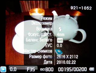 Для записи файлов в jpg формате можно выбрать уровень сжатия (наилучшее, отличное, норма). Также возможно сохранить фотографию в RAW файле или же RAW + JPG. Фокусировка может быть покадровой, непрерывной или ручной. Область фокусировки: АФ по выбору, Матричная, АФ по лицу, АФ автопортрета. Экспозамер: Точечный, Центровзвешенный, Матричный ![]() ![]() ![]() ![]() ![]() ![]() ![]() ![]() ![]() ![]() ![]() ![]() ![]() ![]() ![]() ![]() ![]() ![]() ![]() ![]() ![]() ![]() ![]() ![]() ![]() ![]() ![]() ![]() ![]() ![]() ![]() В ручном режиме съемки на экране можно видеть всю базовую информацию - она отображается иконками. Разрешение и качество снимка, тип фокусировки, светочувствительность, баланс белого, режим работы вспышки и так далее. В нижней части дисплея есть информационная строка, на которой можно увидеть иконку текущего режима работы камеры, время выдержки, значение диафрагмы, шкалу экспозиции, количество места на карте памяти и состояние батареи. ![]() ![]() ![]() ![]() ![]() ![]() ![]() ![]() В режиме просмотра фотографий на экране можно видеть, при каких настройках она была сделана. Можно отобразить их в виде миниатюр по 3, 9, 20 штук. Тут же можно отредактировать их, применив всевозможные эффекты. А можно посмотреть слайдшоу с музыкальным сопровождением. ![]() ![]() ![]() ![]() ![]() ![]() ![]() Примеры фотографий