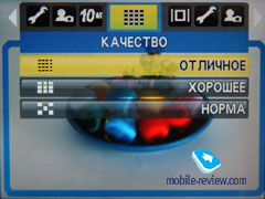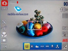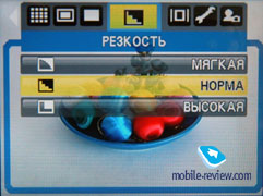 Кроме разрешения, камера позволяет регулировать резкость и уровень сжатия JPEG. В случае если пользователь установил значения этих параметров отличными от того, что было по умолчанию, на съемочном экране будет отображен соответствующий выбранному пункту значок.