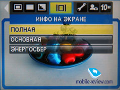 В режиме съемки возможны три варианта работы экрана: отображение полной информации, краткой информации и энергосберегающий режим (отображается вся информация, но экран, спустя несколько секунд бездействия камеры, отключается).