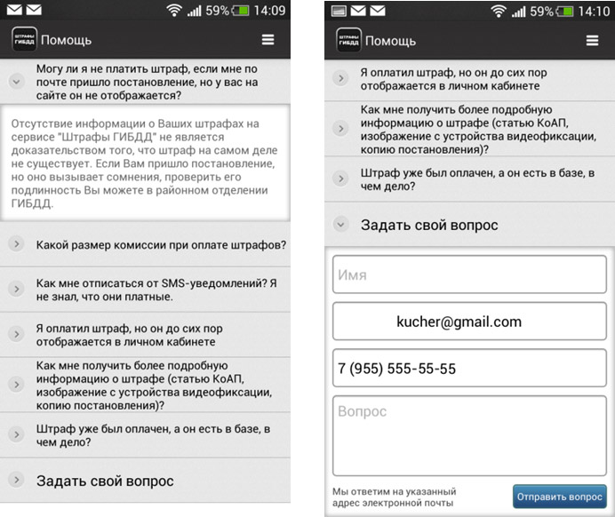 В приложении можно найти ответы на наиболее актуальные вопросы, касающиеся работы сервиса, начисления и оплаты штрафов ГИБДД. Также пользователь имеет возможность задать свой вопрос через интерфейс приложения.