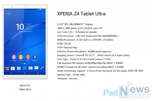 Как известно, в начале следующего года компания Sony планирует выпуск флагманских устройств нового поколения - Z4. Теперь стало известно, что в их числе будет и планшет Sony Xperia Z4 Tablet Ultra. По неофициальным данным, это большое устройство с диагональю дисплея 12,97 дюйма. Экран выполнен по технологии Triluminos IPS + X-Reality и обладает высоким разрешением 3840 x 2400 пикселей (4K UHD).