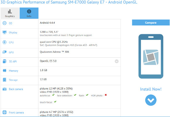 Мы уже неоднократно сообщали об аппарате Samsung SM-E700, который выйдет на рынок как Galaxy E7. Теперь его характеристики появились на сайте бенчмарков GFXBench. Скорее всего именно с такими спецификациями модель и появится на рынке.