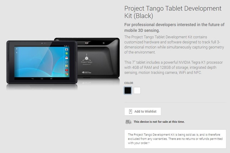 Планшет от компании Google для разработчиков под названием Project Tango поступил в продажу через Google Play Store. Точнее, пока страница продукта говорит о том, что его еще нельзя реально купить, не сообщая о том, когда ситуация изменится. Планшет Project Tango предназначен для профессиональных разработчиков, которые ориентируются на трехмерную чувствительность устройства. В устройстве есть специальное ПО и аппаратное оснащение, позволяющее следить за 3D движениями и захватывать трехмерную геометрию пространства одновременно.