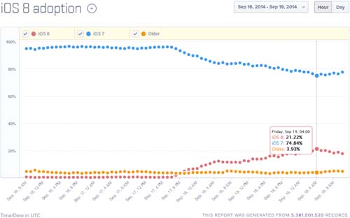 Загрузка пользователями последней версии ОС iOS 8 началась во вторник 16 сентября. А уже к пятнице был преодолен порог обновлений в 1/5 всех устройств от Apple. Пиковое значение было в 4 утра 19 сентября (по Центральному Европейскому времени, 8 утра по Москве) — более 21%. В настоящий момент пропорция несколько изменилась и, по данным Mixpanel по состоянию на 14 часов по Москве на версию iOS 8 перешло чуть менее 18% всех пользователей.