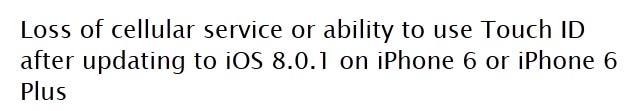Обновление iOS 8.0.1 вместо исправления ошибок в первоначальном релизе системы для некоторых пользователей обернулось еще большими проблемами. Предполагалось, что будут исправлены баги в HealthKit, но вместо этого на новых iPhone 6 и iPhone 6 Plus возникли проблемы с приемом сигнала мобильных сетей и отказ в работе системы Touch ID. Обновление было изъято с сервером загрузки, но ряд пользователей уже успели его загрузить. В Apple быстро отреагировали на проблему и предложили пострадавшим через страницу поддержки загрузить измененные файлы, возвращающие iOS 8.0, которые можно установить на устройство через iTunes.