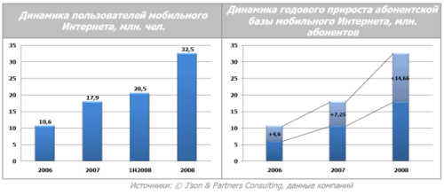 Совокупный годовой прирост абонентов в 2008 году составил 14,7 млн. [+82%] по сравнению с 2007 годом. В 2007 году прирост абонентской базы вырос на 68% по сравнению с 2006.57% абонентов мобильного Интернета проживают в Поволжском, Центральном и Южном Федеральных округах. При этом доля Северо-Западного, Уральского и Дальневосточного округов падает. Доходы от мобильного Интернета за 2008 год составили 657 млн.долл., что на 65% выше аналогичного показателя за прошлый год [+258 млн.долл.].