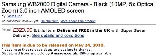 AMOLED экран имеет диагональ 3 дюйма, но не уточняется, является ли он сенсорным, как на других OLED моделях Samsung, или же это обычный видоискатель. Магазин Amazon уже принимает предзаказы на фотоаппарат Samsung WB2000, стоимость которого составляет £329.99 ($532).