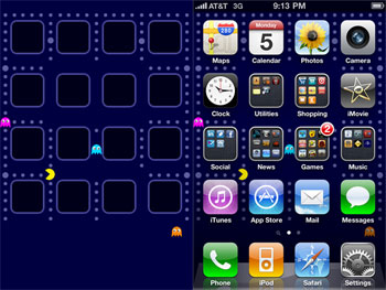 That Super Mario Bros. live wallpaper for Android that we showed you recently obviously threw something of a gauntlet down to the iPhone community and they have answered ... with a Pac-Man wallpaper! The wallpaper is all nice and synced up with the placement of app icons so you can see the wallpaper in its full glory. For those hoping for some interactivity here we have bad news for you, the iPhone does not yet support live wallpapers so this is just a static image (how very 20th century) let alone an interactive wallpaper. The Mario wallpaper for Android was a live wallpaper so no interaction their either, but at least it allowed you to see everyone's favourite Italian plumber leaping and bounding about. If you have an iPhone and can get a data signal then you can download the wallpaper here.