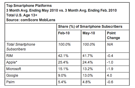 Market research firm comScore has released some very interesting figures that show Google's Android platform surging up the U.S. market share rankings with an increase of 4% in the first 3 months of this year. A 4% increase is notable in and of itself of course, but what makes this increase particularly interesting is that Android is the only major smartphone OS in the U.S. that didn't see a decline in its market share during the same period. RIM, for example, saw its 42.1% share dip 0.4% to 41.7% and Apple saw a larger decline of 1% in the same period. Of course Android's market share as a whole still lags behind both RIM and Apple, indeed Apple commands almost double the share of Android and RIM is still by and far the leader of the pack. However, these figures would seem to suggest a significant swing in favour of Android, but caution is also advised due to the fact that these figures are pre-iPhone 4. When the next set of quarterly results are made known later in the year the iPhone 4, along with major Android releases like the EVO, may have had enough of an impact to see these figures turned on their head, or perhaps not if the figure of 77% of iPhone 4 buyers being existing iPhone owners is to be believed ...