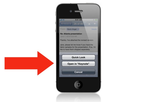 The chaps over at Pocket-lint spotted something rather interesting on a screenshot of the iPhone 4 posted by Apple, namely an option on screen that read "Open in 'Keynote'". The option was on display in the Mail app wholst reading an email. Aside from the obvious questions it raises the matter gets even more interesting in that Apple quickly pulled the screenshot and replaced it with a similar one, the difference being the previous option had been replaced with one reading "Open in 'iBooks'". It looks therefore as if iWorks will be coming to iOS 4, sooner rather than later if the original screenshot was anything to go by. No doubt it will see service across the full range of iOS devices, including the iPad and it is almost certainly a feature that many people will make good use of to get some work done whilst on the move. It's curious though that Apple didn't mention anything about this at yesterday's keynote event, but presumably it isn't quite ready yet although if they have screenshots made up already one assumes it's not far off completion. Don't expect this to be free, if Apple are charging for iMovie on iOS then they'll be charging for iWorks too.
