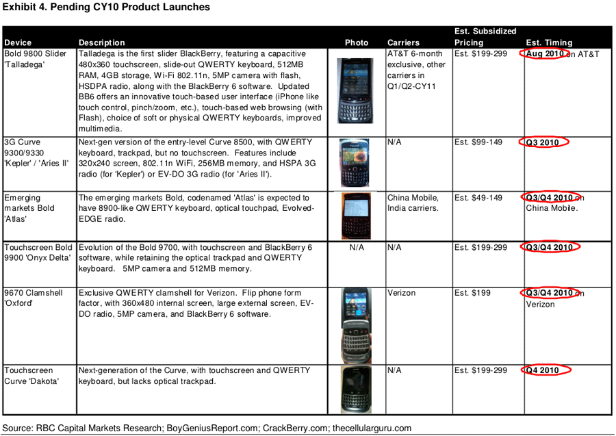 An analyst at RBC Capital Markets, Mike Abramsky, has very handily created a table of upcoming Blackberry products from the copious information that has been leaking from the Canadian manufacturer over the past several months. There are also some new pieces of information present, such as the Onyx Delta, which is now listed as the 9900, whereas before it as being refered to as the 9700a and was thought to be little more than a rehash. Rather it is being touted as featuring a touchscreen here. Check out the table at the bottom for the full details of what is known at present and the list below shows what should be released and when.