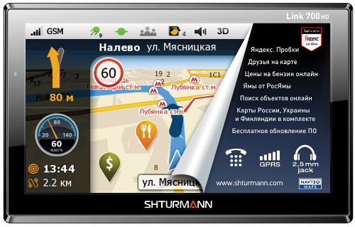 Shturmann Link 700HD, помимо 7-дюймового резистивного дисплея с разрешением 800х480 точек и стандартных разъёмов для подключения внешних устройств, оборудован также USB-хостом для flash-накопителей. Встроенный GPRS-модем обеспечивает новинку интернет-связью для доступа ко всем онлайн-сервисам навигации Shturmann, включая Яндекс.Пробки.