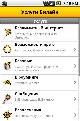 Оператор ВымпелКом объявил о запуске приложения «Услуги Билайн» для смартфонов под управлением ОС Android. Обновленное приложение «Услуги Билайн» обладает расширенной функциональностью. Оно позволяет не только управлять сервисами, но и оптимизировать затраты на связь. Обращаясь к телефонной книге абонента, приложение отмечает номера телефонов «Билайн», относящиеся к домашней сети. Данная функция дает абоненту возможность подбирать услуги «Билайн» для общения с различными группами абонентов.