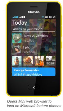 Норвежская компания Opera Software объявила о том, что Opera Mini станет браузером по умолчанию в телефонах Microsoft, в том числе в линейке телефонов серии Asha. Лицензионное соглашение, заключенное между Microsoft и Opera Software, охватывает все мобильные телефоны семейств Series 30+, Series 40 и программной платформы Asha. Обладателям этих устройств, использующим существующий браузер Xpress для доступа в интернет, будет предложено установить последнюю версию браузера Opera Mini. При этом в новых устройствах, поступающих в продажу, браузер Opera Mini будет предустановлен изначально.