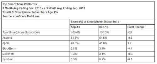 Аналитическое агентство comScore опубликовало отчет о рынке смартфонов США по состоянию на конец последнего квартала 2013 года. Радикальных изменений на нем не произошло — определяющими компаниями выступают Apple и Samsung, которые не только не потеряли своих позиций, но и сумели за прошедшие три месяца их укрепить. Обе компании выросли на 1,2 процентных пункта достигнув соответственно показателей в 41,8% и 26,1% рынка. В итоге к началу 2014 года в США два из трех аппаратов в руках пользователей будут принадлежать именно этим производителям.