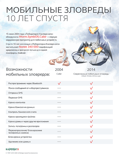 Ровно 10 лет назад "Лабораторией Касперского" был обнаружен Cabir - первый в своем роде червь, нацеленный на мобильные устройства. В отличие от современных мобильных зловредов Cabir не был оснащен широким набором вредоносных функций. Несмотря на это, он вошел в историю, первым продемонстрировав, что мобильные устройства также могут быть интересны злоумышленникам. Специалисты компании впервые столкнулись с Cabir в начале июня 2004 года. Один из антивирусных аналитиков "Лаборатории Касперского" обратил свое внимание на почтовое сообщение без текста, которое, тем не менее, содержало вложение. Прикрепленный файл показался сотрудникам подозрительным: быстрый анализ не позволил определить, для какой платформы он был создан - по крайней мере, не для Microsoft Windows или Linux, с которыми обычно приходилось работать аналитикам на тот момент. Затем эксперты определили, что файл был написан для запуска на ОС Symbian, мобильной операционной системе, которая обеспечивала функционирование аппаратов Nokia.