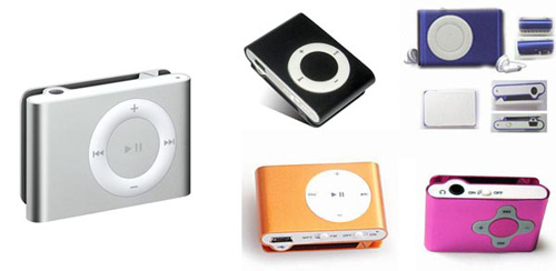 За 2007 алюминиевые подражатели nano 2G по большому счету вытеснили полупластиковые копии первого поколения самого тонкого iPod-а. Главное отличие от оригинала – развернутый вдоль плеера дисплей, хотя встречаются и исключения. Второе отличие: на ощупь вместо сенсорного Click Wheel – банальная навигационная клавиша. С дизайном последней производители, претендующие на оригинальность, иногда идут на эксперименты. ![]() Клоны nano постепенно выздоровели от своих ранних болячек, таких, как 2.5 мм разъем для наушников на боковой стороне, уродливый и неудобный интерфейс, ущербное звучание. Свежие варианты на платформе ALi представляются уже достаточно «съедобными». iPod Shuffle второго поколения стремительно догоняет nano по количеству клонов. ![]() Китайских разработчиков привлекает дешевизна решения. Стоит отметить, что копии этого плеера критиковать сложно – набор функций аналогичен, управление тоже. Единственным отличием зачастую является отсутствие поддержки iTunes, замененной на обычный UMS, да и это для многих, наоборот, будет плюсом. Вдобавок во многих псевдошаффлах можно найти стандартный разъем mini-USB вместо подключения через mini-jack 3.5 у оригинала (наушники при этом подключаются через обычный разъем). Немало производителей добавляет в аппарат одно-двустрочный дисплей. ![]() Таким образом, если оставить в стороне ценность бренда, то человека, который предпочел куда более дешевый клон с лучшей функциональностью оригиналу, сложно упрекнуть в неразумности. Но не надо забывать, что это скорее исключение, обусловленное ограничениями объекта копирования. ![]()