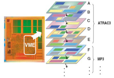 Схематическая иллюстрация принципа работы Virtual Mobile Engine VME решает эту проблему. Подробностей о DSP, которым, собственно, VME и является, Sony, понятное дело, не сообщает. Но из той информации, которая все же доступна, становится ясно, что мы имеем дело с чрезвычайно гибкой динамической архитектурой, способной подстраиваться под разные задачи, своеобразным DSP-«оборотнем». Только что он был узкоспециализированным ATRAC-декодером, а спустя микросекунду он уже обратился в столь же узкоспециализированный MP3-декодер. Также он способен приспосабливаться и к другим задачам, будь то эквалайзер или звуковые эффекты. В остальном новая платформа, первое воплощение которой получило название CXR704060, немного напоминала чипы от Philips: то же 32-битное ARM7-ядро для «легких» задач, к которым нецелесообразно привлекать VME. USB-интерфейс версии 1.1. Контроллер для флэш-памяти. Контроллер для карт памяти – разумеется, только для Memory Stick (здесь сходство с Philips заканчивается). Отдельное ядро для столь горячо любимой Sony DRM-технологии Magic Gate. 16-битный цифро-аналоговый преобразователь. Так как возможность цифровой записи нужна только пиратам, то плееры порядочной компании таких возможностей иметь не должны, а значит, полноценный аналого-цифровой преобразователь не нужен, достаточно 10-битного.