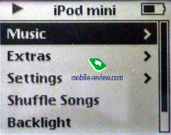 Меню iPod Mini представлено в виде списка, каждый из пунктов открывает соответствующее подменю. Перемещения между пунктами осуществляются с помощью сенсорного колеса, это очень удобно при прокрутке большого количества пунктов. Подобная организация меню наглядна и легка для освоения, одновременно на дисплее представлено несколько пунктов, отдельно указывается возможность прокрутки. Основное меню плеера не перегружено и включает в себя разделы Music, Extras (дополнительные возможности), Settings (настройки) и Now Playing. Также присутствуют пункты переключения в режим случайного воспроизведения (Shuffle Songs) и включения-выключения подсветки (Backlight). К сожалению, все меню плеера не циклические, чтобы вернуться к первому пункту с последнего, приходится прокручивать все пункты, расположенные между ними. Справедливости ради стоит отметить, что с помощью сенсорного колеса делать это гораздо легче, чем на большинстве устройств с подобной организацией.