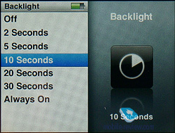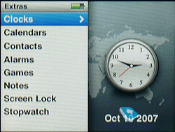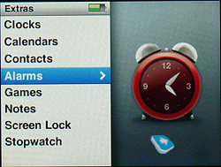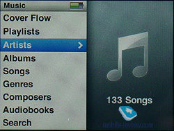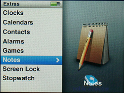 Videos. Просмотр видеороликов. Все файлы разделены на просто ролики, телепрограммы и видеоклипы (отсыл к магазину iTunes). Здесь же вызываются плей-листы видео и производится настройка параметров вроде формата изображения видеовыхода, полноэкранного воспроизведения и активации субтитров. Photo. Содержит в себе все папки с загруженными изображениями, а также все связанные с этим настройки, от времени между переключением слайдов до выбора сопровождающей музыки, повтора, активации случайного порядка и выбора типа перехода. Extras. Дополнительные функции плеера: внешний вид и установки системных часов, игры, записная книжка, органайзер, заметки, секундомер, будильник и пароль. Settings. Самый объемный раздел меню, здесь собраны настройки всех аспектов функционирования плеера. Из этого раздела можно просмотреть информацию о версии программной прошивки, сконфигурировать главное меню, включить случайный порядок воспроизведения композиций, выбрать режим повторного воспроизведения, настроить время работы подсветки и скорость воспроизведения аудиокниг. Кроме того, здесь же находятся настройки записной книги, системной даты и времени и языка меню. Отдельные пункты позволяют включить или выключить режимы ознакомительного воспроизведения, автоматическое создание компиляций и сигналы встроенного динамика – по умолчанию он издает тихие щелчки во время работы с сенсорной областью.