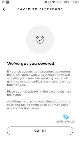 Подаваемая мелодия в моём сценарии играла на среднем уровне громкости, при этом остальные звуки не то чтобы полностью отсекались, но в значительной степени сглаживались. Я в этом плане воспользовался стандартными параметрами, громкость выставлял на одно деление меньше отмеченного черточкой значения. Очень важно, на мой взгляд, выбрать необходимый уровень «зашумления», чтобы не пропустить важный звонок / будильник, плач ребёнка, стук в дверь, сработавшую сигнализацию автомобиля или пожарную тревогу, о чём есть предупреждение в приложении. Пиковый уровень звукового давления Sleepbuds не повлияет на слух, беспокоиться не стоит.