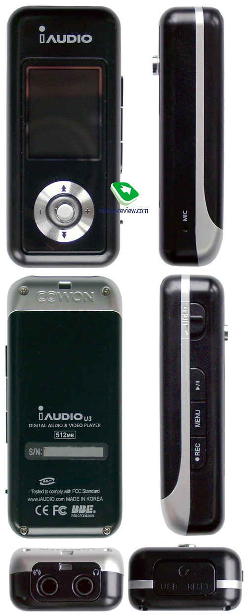 На лицевой панели U3 расположен прямоугольный ЖК-дисплей и довольно крупный пятипозиционный джойстик. Задняя панель оставлена пустой, на нее лишь нанесена информация об устройстве и серийный номер. Ориентация плеера горизонтальная, так что боковые панели у него получаются верхней и нижней. На верхней боковой панели конструкторы разместили три кнопки средних размеров и сдвижной переключатель блокировки управления, на нижней нашлось место для отверстия микрофона. На левом торце расположены два разъема в конструктиве minijack, один из них служит для подключения наушников, другой выступает в роли линейного входа. Наконец, на правом торце под крышкой из жесткого пластика находится разъем USB и кнопка принудительной перезагрузки плеера.