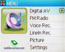 Основное меню плеера имеет сквозную вертикальную организацию. Разделы представлены надписями и качественно прорисованными графическими значками. Разделы меню: Digital AV, FM Radio, Voice Rec, LineIn Rec, Picture, Settings.