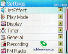 Settings. Меню настроек. Здесь производится настройка всех аспектов функционирования плеера. Включает в себя разделы Jet Effect, Play Mode, Display, Timer, General, Recording, FM Radio и Information.