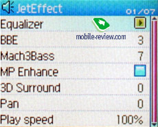 Jet Effect. Содержит все настройки звучания плеера. Здесь можно выбрать предустановку эквалайзера или настроить его вручную, отрегулировать уровень воздействия на звук систем улучшения звучания высоких частот BBE и усиления низких частот Mach3Bass. Также здесь активируются системы улучшения звучания MP Enhance и расширения стереобазы 3D Surround и регулируется уровень разделения каналов (Pan) и скорость воспроизведения.