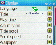 Display. В этом разделе сосредоточены все настройки работы дисплея. Пользователь может выбрать язык отображения информации из тегов ID3 или меню, режим отображения имени файла или тега ID3, режим отображения времени (прошедшее или оставшееся), способ прокрутки названий файлов и папок. Кроме того, пользователь может выбрать заставку для дисплея, включить или выключить строку статуса и отображение слов песен из соответствующих файлов. Наконец, здесь же можно выбрать «обои» и настроить скорость прокрутки содержимого дисплея, яркость, контрастность и время работы подсветки.