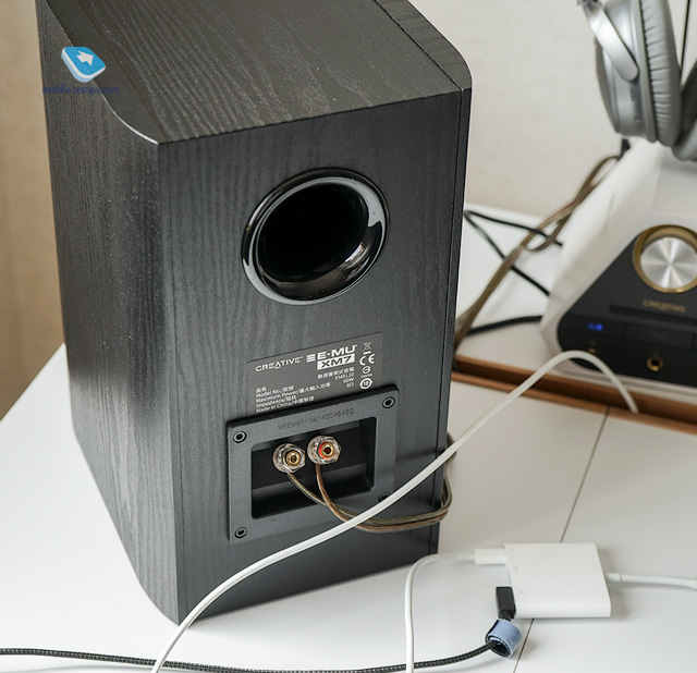 Акустическая система E-MU XM-7Система выпускается в коричневом или в черном корпусе, мне досталось устройство черного цвета. Тканевые накладки снимаются, в комплекте толстенный медный кабель, длина достаточна для подключения системы даже на огромном столе или на подставках в разных углах небольшой комнаты. На задней части фазоинвертор, впереди однодюймовый твитер, под ним пятидюймовый средне-низкочастотный динамик. Колонки получились максимально универсальными, легко настраиваемыми, широкие возможности регулировок с помощью X7 позволяют использовать XM-7 в паре с самой разной техникой. Например, с телевизором.