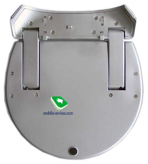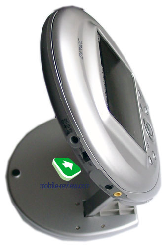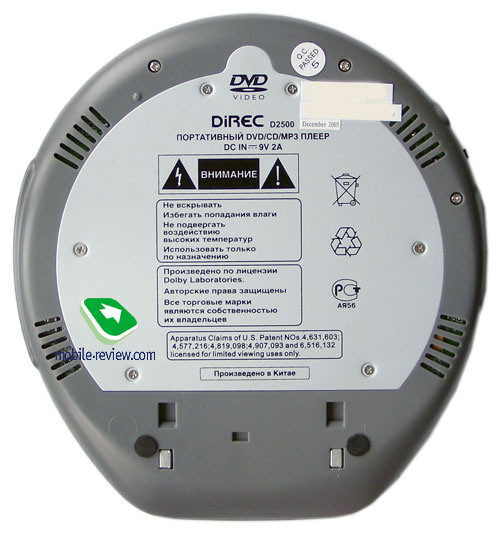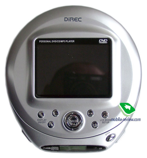 DiRec D2500 обеспечивает воспроизведение обычных CD и DVD, а также поддерживает форматы цифрового аудио МР3 и WMA и графические файлы JPEG. Главная отличительная особенность аппарата – наличие встроенного цветного дисплея, подходящего для просмотра видео и изображений. Плеер снабжен цифровым аудиовыходом, поэтому при желании его можно подключить к декодеру объемного звучания, хотя представить, кому это может понадобиться, довольно трудно. Конструктивно D2500 отличается от обычных CD-плееров, хотя на первый взгляд это не сразу заметно. Дело в том, что источник питания плеера вынесен из корпуса и выступает в качестве подставки для просмотра. Подробнее об этом в соответствующем разделе. Корпус и дизайнПлеер имеет классический округлый корпус и весьма сильно напоминает модели прошлого века, когда портативные CD-плееры были довольно крупными устройствами и к тому же стоили серьезных денег. Внешне D2500 выделяет довольно крупный дисплей, расположенный на крышке отсека для диска, одновременно выступающей лицевой панелью корпуса. Плеер в целом выглядит привлекательно и необычно, внешнее впечатление от него портят лишь «устаревшие» габариты. Материал корпуса – гладкий серебристый пластик. Качество изготовления находится на среднем уровне, детали плотно подогнаны, зазоры не слишком велики, однако местами наблюдается их некоторая неравномерность. Дефекты литья отсутствуют или незначительны.
