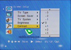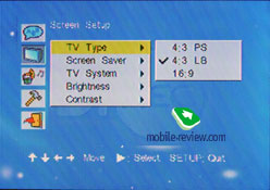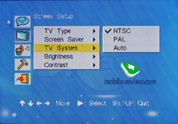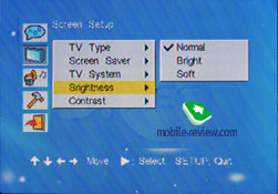 Основное меню имеет вертикальную организацию и представлено небольшими графическими значками. Пункты каждого раздела появляются справа от значка, напрашивается аналогия с организацией меню Windows. Меню включает в себя разделы Language Setup, Screen Setup, Audio Setup, Custom Setup, Exit Setup. Language Setup. Выбор языка меню, аудиодорожки и субтитров. Screen Setup. Настройка отображения: соотношение сторон внешнего дисплея (4:3, 16:9), система вещания (PAL, NTSC), заставка дисплея. Здесь же настраивается яркость (три уровня) и контрастность (6 уровней). Стоит отметить, что отдельное меню, вызываемое во время просмотра или в режиме остановки, позволяет настроить яркость, контрастность и насыщенность в широких пределах с малым шагом.