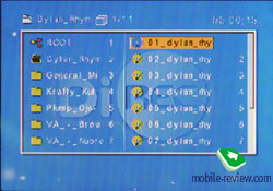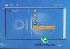 Плеер позволяет прослушивать файлы форматов МР3 и WMA, записанные на диски CD-R и CD-RW, а также размещенные на фабрично изготовленных дисках. Казалось бы, имея считывающий механизм с поддержкой DVD, что стоит реализовать воспроизведение файлов с DVD-болванок, благо последние недавно серьезно упали в цене. Как бы то ни было, данная функция плеером не поддерживается, видимо, производитель «зарезервировал» ее за следующей моделью, если таковая, конечно, появится. Можно пренебречь заявленными данными и вставить в плеер DVD-R с записанными на него файлами МР3 и WMA. В этом случае плеер прочтет файловую систему на диске с ошибками, и для воспроизведения будет доступно всего лишь несколько случайных файлов. Несмотря на то, что D2500 позиционируется как МР3/DVD-плеер, его истинным предназначением является все же работа с DVD. Об этом говорит, например, полное отсутствие эквалайзера и системы работы с плейлистами. Аппарат позволяет прослушивать музыку и осуществлять навигацию по содержимому диска, но не более того.