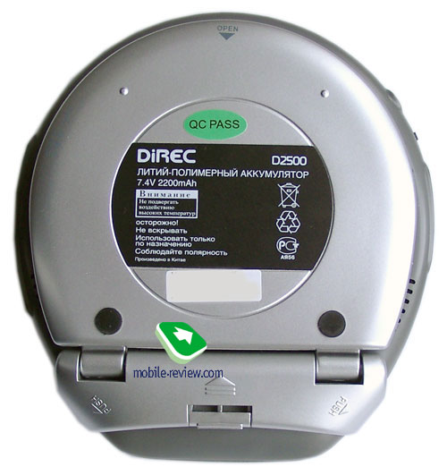 Audio Setup. Активация цифрового выхода, выбор формата сигнала: SPDIF/PCM или SPDIF/RAW. Custom Setup. Дополнительные настройки: пароль для доступа, угол просмотра (для дисков с поддержкой данной функции), «родительский контроль» (запрет просмотра соответствующе маркированных дисков). Отсюда же производится сброс всех настроек на фабричные значения. Меню D2500 организовано логично, пользоваться им удобно. В силу небольшого количества разделов времени на его освоение не требуется. Некоторый дискомфорт вносит лишь небольшой размер букв. ПитаниеИсточником питания плеера выступает внешний литий-полимерный аккумулятор емкостью 2200 мА/ч и напряжением питания 7,4 В. Аккумулятор крепится к корпусу плеера с помощью специальных защелок и при необходимости выполняет функцию подставки с регулируемым углом наклона. Заявленное производителем время просмотра видео от одного заряда аккумулятора составляет 2,5 часа. В процессе тестирования плеер проработал около двух часов при условии интенсивного использования меню, переключения между различными функциями и смены дисков.