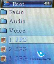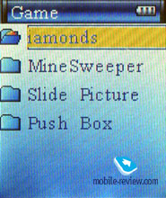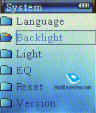 Games. Игры. Раздел содержит четыре игры, о них подробнее далее. E-Book. Просмотр текстовых файлов. Picture. Просмотр графических файлов. System. Раздел системных настроек. Содержит меню выбора языка (русский/английский), регулировки уровня контрастности (33 уровня), времени работы подсветки, режима выключенной подсветки (полупрозрачный или темный дисплей), эквалайзера. Здесь же производится сброс всех настроек на фабричные установки и просмотр версии текущей программной прошивки.