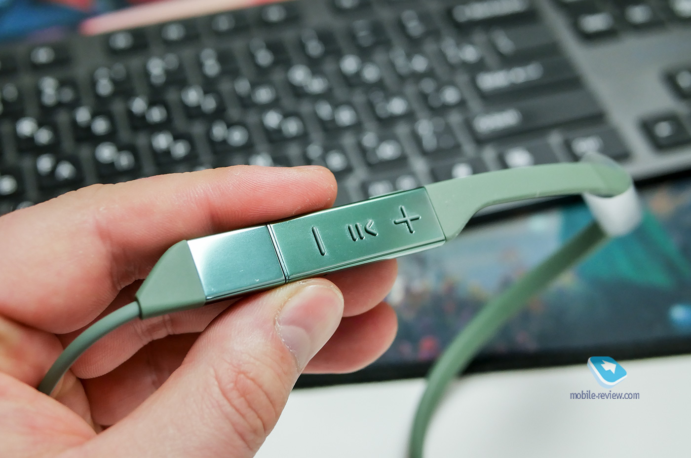 В продаже три цвета: черный, белый, зеленый. Кабель силиконовый, покрыт слоем софт-тач. Гнется отлично. Блоки металлические, глянцевые. Кнопки рельефные, сделаны из пластика того же цвета, что и кабель. Вся конструкция весит около 35 граммов. Немного, но стоит понимать, что это определенный тип наушников, к которым придется привыкать. Мне любые кабели кажутся чем-то инородным, поэтому предпочитаю TWS.