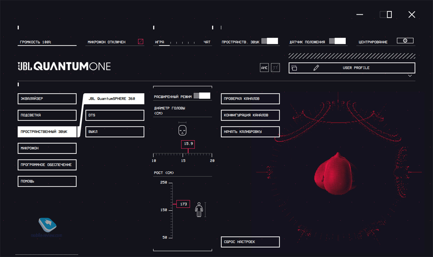 Мне эта фишка зашла больше всего. В игрушках вы слышите происходящее именно там, где оно происходит. Эта фишка работает и при просмотре фильмов. В качестве простого примера: на экране два человека общаются между собой, и звук вы слышите ровно по центру. Как только начинаете отклонять голову влево или вправо, то звук моментально изменяет направление диалога людей. Причем это происходит идеально синхронно. Очень необычно, эффект присутствия 100%. Для подстройки QuantumSPHERE 360 нужно зайти в приложения и произвести центровку, выбрать диаметр вашей головы и выставить рост. Пробовал баловаться с последними двумя параметрами, но так и не услышал разницы в звуке. Также в приложении для ПК есть эквалайзер на 10 полос: от 31 Гц до 16 кГц. Пара слов про микрофон в той же JBL Quantum Engine. Есть выбор громкости и усиления собственного голоса. Мне показалось, что чувствительность средняя, хотелось бы выше. Наверное, вы это заметите по записи звука ниже. Пример аудиозаписи (Quantum One) >>> Про звук. Он похож на тот, что дают наушники JBL Club 950nc. Неплохой бас, голос слышно прекрасно, а вот высокие звучат примитивно. Еще что меня смутило – громкость. Она невысокая. Точнее, так: она достаточна для просмотра фильмов или игрушек в тихом месте. Не хватает еще процентов 20-30. Громкость выкручивал на максимум и на самой гарнитуре, и на выносном блоке, и на ПК. Так, к слову. А еще в Quantum One присутствует технология активного шумоподавления. Она зверски давит шумы, иной раз даже не слышно клацанья игровой клавиатуры во время жарких баталий. Впрочем, звуки из открытого окна слышны без труда. Вероятно, так было задумано. Можно было бы еще больше написать про JBL Quantum One, но здесь уже важны реальные впечатления от звука и бесконечного числа настроек гарнитуры в приложении Quantum Engine. Гарнитура JBL Quantum 800С точки зрения технических характеристик гарнитура Quantum 800 почти один в один как Quantum One, но у первой нет отслеживания положения головы, она подключается по Bluetooth/3.5 мм/USB, микрофон нельзя отсоединить, подсвечиваются только логотип и кольцо.