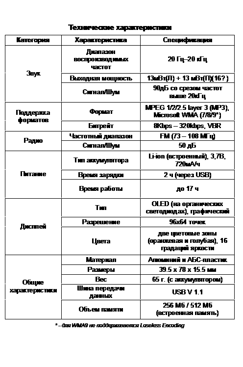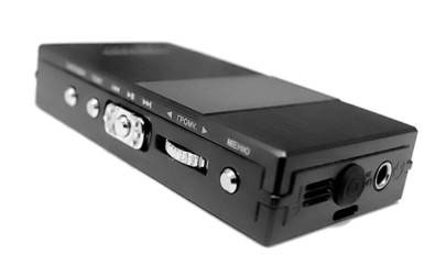 На верхнем торце плеера располагаются: разъем для наушников, разъем линейного входа, закрытый резиновой заглушкой, микрофон и крепление для шнурка. Слева – кнопка включения/выключения, кнопка записи и переключатель режима блокировки. Справа – меню, колесико электронного регулятора громкости, слайдер перемотки, в его центре находится кнопка проигрывания/паузы, далее следует кнопка темпа и кнопка закладок. На нижнем торце плеера находится только разъем mini-USB, закрытый откидной крышечкой. На тыльной стороне плеера можно увидеть четыре маленькие резиновые ножки для уменьшения скольжения и вибраций поверхности, при записи с диктофона. Четвертую часть передней панели устройства занимает зеркальная акриловая пластина, более легкая и прочная, чем обычное стекло, за которой скрывается дисплей. Пока экран выключен, его совсем не видно – зеркало как зеркало (Philips называет этот факт «волшебным зеркалом» и использует в некоторых своих телефонах-раскладушках). Включенный же дисплей достаточно яркий и контрастный, чтобы разбирать на нем символы даже днем на солнце (если не отсвечивать зеркальцем себе в глаз), сияет цветом, а точнее даже двумя (оранжевый и бирюзовый), у каждого из которых по 16 градаций яркости. Применение OLED технологии позволяет снизить энергопотребление дисплея, получить гораздо большие характеристики яркости и контраста, нежели у моделей, построенных по LCD технологии.