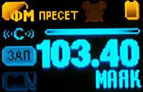 При включении радио, на дисплее отображается частота, название станции (в случае если она уже присутствует в списке радиостанций из файла broadcat.txt, находящегося в системной папке плеера), индикатор стерео/моно, ручной установки моно, записи и наличия установленной частоты в предустановках.