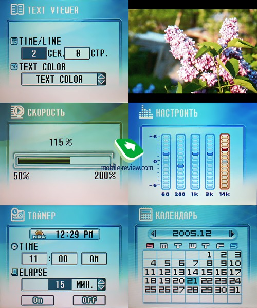 Видео, изображения, текстВ качестве видео аппарат способен воспроизводить ставший уже традиционным формат MPEG4 Pixtree в контейнере MP4. Перекодировка в него осуществляется комплектной программой-транскодером. Разрешения поддерживаются вплоть до QCIF+, частота кадров – 15/с. Как обычно, MPEG4 Pixtree неплохо сжимает контент, MP4-ролики занимают сравнительно немного места. Видеоплеер поддерживает перемотку, постановку проигрывания на паузу, а также запоминает момент, на котором проигрывание было остановлено (если только после этого не открыть другой видео-, текстовый или аудиофайл). Дисплея XZ-22 уже может хватить для многих пользователей, чтобы просматривать не только мультипликационные, но и обычные фильмы, хотя эта функция, скорее всего, больше заинтересует молодежь, для старшей аудитории долгий просмотр видео на таком дисплее утомителен. Из изображений XZ-22 поддерживает исключительно JPEG. Прогрессивное сжатие не поддерживается, поэтому не надо ожидать, что вам удастся посмотреть на нем любой «прикол» из Интернета, но с отображением фотографий он справляется. Фото среднего размера полностью отображается примерно за 3 секунды. По сравнению с XZ-22, XZ почему-то лишился возможности увеличения изображения, зато обрел возможность слайд-шоу. Поддерживается возможность просмотра фото (в т.ч. и слайд-шоу) под музыку. Размера дисплея хватает для фотографий без мелких деталей: для пейзажей или групповых снимков, к примеру, начинает не хватать разрешения дисплея и возможности увеличения изображения. Плеер имеет встроенную читалку для текстовых файлов, поддерживается только TXT-формат. Функционально она не представляет собой ничего выдающегося: поддерживается настройка цвета для шрифта и фона, настраиваемая автопрокрутка. Довольно неприятно, что прокрутка ручная, осуществляется нажатием на навигационную клавишу влево-вправо, хотя текст движется вверх или вниз. Это является следствием того, что верхнее и нижнее направление навигационной клавиши занято под регулировку звука, если во время чтения идет проигрывание музыки. «Большие» медиаплееры выходят из подобных ситуаций при помощи дополнительных клавиш регулировки громкости. Здесь их нет, это подчеркивает, что XZ-22 все-таки не до конца PMP, и его создатели считали просмотр немузыкального контента лишь бонусом, не основным занятием для пользователя. При просмотре текста на дисплее отображается 8 строк по 24 символа, это 2-3 предложения. В сочетании с крупным шрифтом и качественным контрастным дисплеем этого могло бы хватить для использования плеера в качестве электронной книги. Все портит один недочет: аппарат «не понимает» абзацев, весь текст идет сплошным потоком. Это традиционный дефект платформы Telechips, его присутствие досадно, особенно на фоне того, что некоторые плееры умудряются им не страдать. Прочие функцииПлеер имеет встроенный монодинамик достаточно большой мощности. Для него есть достаточно много применений: можно прослушивать диктофонные записи, музыку, фильмы без помощи наушников. XZ-22 достаточно гибок в плане настройки источника звучания, по желанию пользователя плеер может проигрывать только через наушники, только через динамик, через оба источника или осуществлять выбор автоматически. Это позволяет, к примеру, прослушивать через динамик радиопередачи, не отключая наушники-антен