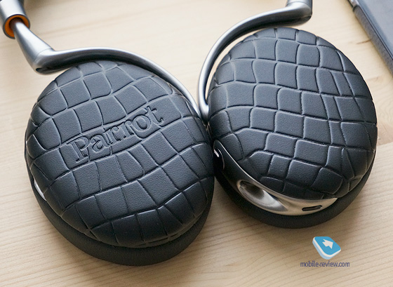 Кожа качественная, внутри на чашках обычная фактура, датчики и прочее никуда не пропали: сняли наушники - воспроизведение приостанавливается. Основа наушников - металл, металлические секции поворачиваются на сгибе, на примыкающих к ним деталях есть риски, чтобы можно было правильно выбрать длину. Они прячутся внутри оголовья, отделанного кожей, на верхней части – надпись Parrot. Сборка отличная, тут вопросов нет.