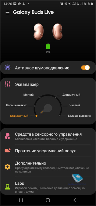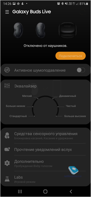Самое время рассказать про приложение и настройку наушников. Они могут работать с любым смартфоном с Android 5 и оперативной памятью 1.5 ГБ, а также с iPhone на iOS 10 и выше (начиная с iPhone 7). Для работы с наушниками нужно загрузить приложение Galaxy Wearable, в нем можно настроить наушники, управлять эквалайзерами. Синхронизация происходит практически моментально.