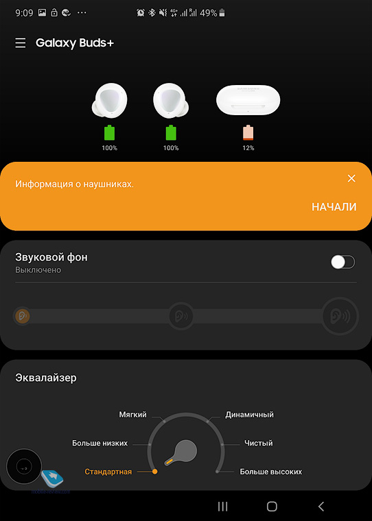 Самое время рассказать про приложение и настройку наушников. Они могут работать с любым смартфоном с Android 5 и оперативной памятью 1.5 ГБ, а также с iPhone на iOS 10 и выше (начиная с iPhone 7). Для работы с наушниками нужно загрузить приложение Galaxy Wearable, в нем можно настроить наушники, управлять эквалайзерами. Синхронизация происходит практически моментально. На iOS приложение стало очень похожим на то, что вы видите на Android, также появились эквалайзеры и другие настройки.