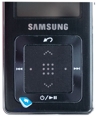 Модуль расположен на лицевой панели, под дисплеем, и имеет размеры 3х3 см. Конструкция модуля такова: в центре находится сенсорная площадка с четырьмя чувствительными к прикосновению участками и фиксирующая нажатия. Площадка обрамлена квадратным элементом, который также фиксирует нажатия по четырем точкам. С помощью сенсорной площадки осуществляется навигация по меню, спискам и матрице фотографий, производится подтверждение выбора. «Рамка» служит для переключения между композициями, включения и выключения питания, запуска и остановки воспроизведения, а также возврата на предыдущий уровень меню. Удобство реализации управления находится на достойном уровне, Samsung удалось создать систему управления, не похожую на применяемые другими компаниями и одновременно эффективную. Учитывая объем усилий, постоянно прилагаемый всеми производителями для придания своей продукции уникальности, этот факт не может не вызвать уважения. Дисплей и менюДисплей плеера имеет диагональ в 1,8 дюйма и занимает практически половину лицевой панели. Качество изображения среднее для Samsung, учитывая большие достижения компании в области дисплеев для портативных устройств: пиксели дисплея довольно хорошо заметны, то есть его разрешение в 128х160 пикселей не «догоняет» диагональ. На свету «картинка» меркнет, но остается читаемой, благо системные шрифты хорошо подобраны и имеют достаточный размер. Цвета изображения сочные, насыщенные. В целом дисплей заслуживает хорошей оценки, его единственным недостатком является довольно крупный размер пикселей.