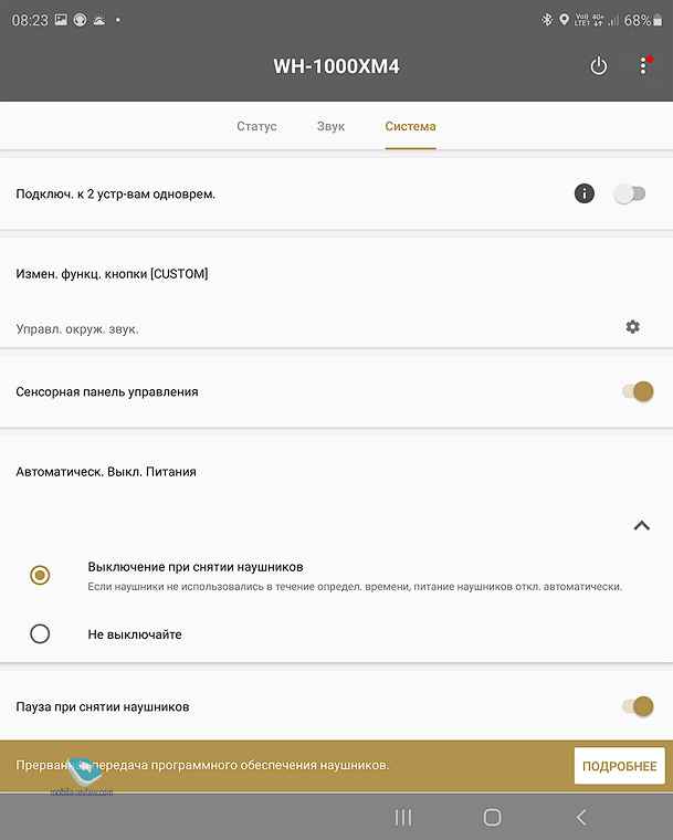 По сравнению с XM3 кажется, что тот же процессор не может добавить что-то к наушникам, но это ошибка. Большее число сценариев, наушники научились определять типовые шумы города, транспорта и эффективно с ними бороться. Добавления этих сценариев в XM3 не произошло, вряд ли это случится с этими наушниками. При подключении к двум устройствам одновременно вы не сможете использовать кодек LDAC, доступен только AAC. При использовании техники от Apple в любом случае у вас не будет выбора, звук проще, чем на Android, и более плоский. Хотя к этому большинство пользователей компании привыкли и считают это нормой. Теперь про качество звука. Инженеры Sony явно пытались отработать негатив, связанный с тем, что XM2/XM3 меняют звук, прибавляют басы, красиво окрашивают песни и делают их приятными, но другими по сравнению с оригиналом. Всегда говорил, что меня это не волнует, так как в самолете получаю возможность слушать музыку с таким качеством, как никогда. И требовать, чтобы наушники передавали звук как можно более естественно, без улучшалок, как-то странно. В XM4 инженеры Sony решили, что могут изменить звучание так, чтобы вы получали максимально естественный звук (для многих это вовсе не то, что люди думают и чего ждут). И по умолчанию, без эквалайзеров, звук именно такой. Включите эквалайзер “Яркий”, чтобы получить такое же звучание, как на XM3. Наушники стали комфортнее для всех, каждый может получить тот звук, к которому привык. И это можно только приветствовать, готов аплодировать инженерам компании. Восторг. Работа в качестве гарнитуры не вызывает вопросов, собеседник вас слышит отлично, нет никаких проблем. Программа для смартфона – настраиваем наушникиИспользовать наушники можно и нужно с фирменной программой от Sony, иначе вы не раскроете и десятой доли их возможностей. При первом подключении на Android вам достаточно прикоснуться к NFC-значку на наушниках, и произойдет спаривание. В программе вы выбираете приоритет звука или качество соединения, можете настроить наушники под давление (важно в самолете), есть эквалайзеры и другие улучшалки. Программа также может распознавать, что именно вы делаете – стоите, идете или бежите. В зависимости от этого также меняются настройки, режим работы. Многих раздражало, что в адаптивном режиме, когда менялись настройки шумоподавления, наушники издавали звук и резкое переключение режима хорошо ощущалось. Теперь вы можете убрать звук вовсе, а переключение происходит мягко. Хорошая фишка – это определение вашего местоположения, наушники автоматически будут менять настройки в зависимости от того, где вы находитесь. В моем доме шел ремонт у соседей, постоянно сверлили и что-то делали, можно было сойти с ума. Поэтому настроил наушники так, чтобы шумоподавление дома было максимальным, а вот в офисе средним, с упором на голос (когда к тебе обращаются, а ты не слышишь, это не слишком вежливо). Работает на ура, и не требуется что-то включать руками. ВпечатленияВ Sony создали бестселлер, такой же, как XM3, что перевернул представления о том, что должны уметь наушники с шумоподавлением (напоминаю, что при проводном подключении вы получите другое качество звука, наушники очень хороши и в этом случае). У меня от этих наушников только одна эмоция – восторг, чистый и незамутненный. Отличный звук, количество технологий, вложенных инженерами Sony в небол