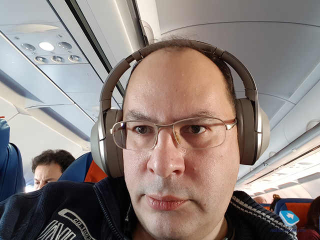 Приложив ладонь к правому наушнику, вы приглушите музыку и включите внешние микрофоны, это удобно, когда к вам обращается стюардесса. Срабатывает наушник не моментально, на это уходит секунда.